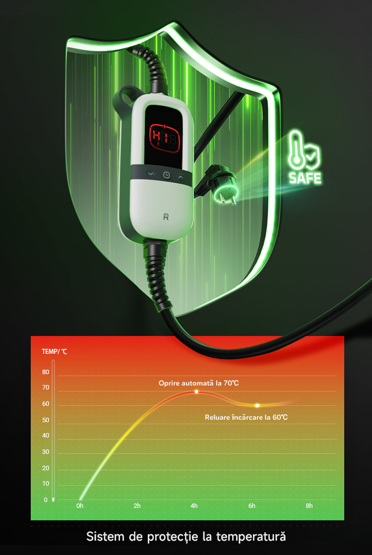 Charging stops automatically if the plug temperature exceeds 70°C and resumes when it drops to 60°C, ensuring safe charging sessions for you and your car.