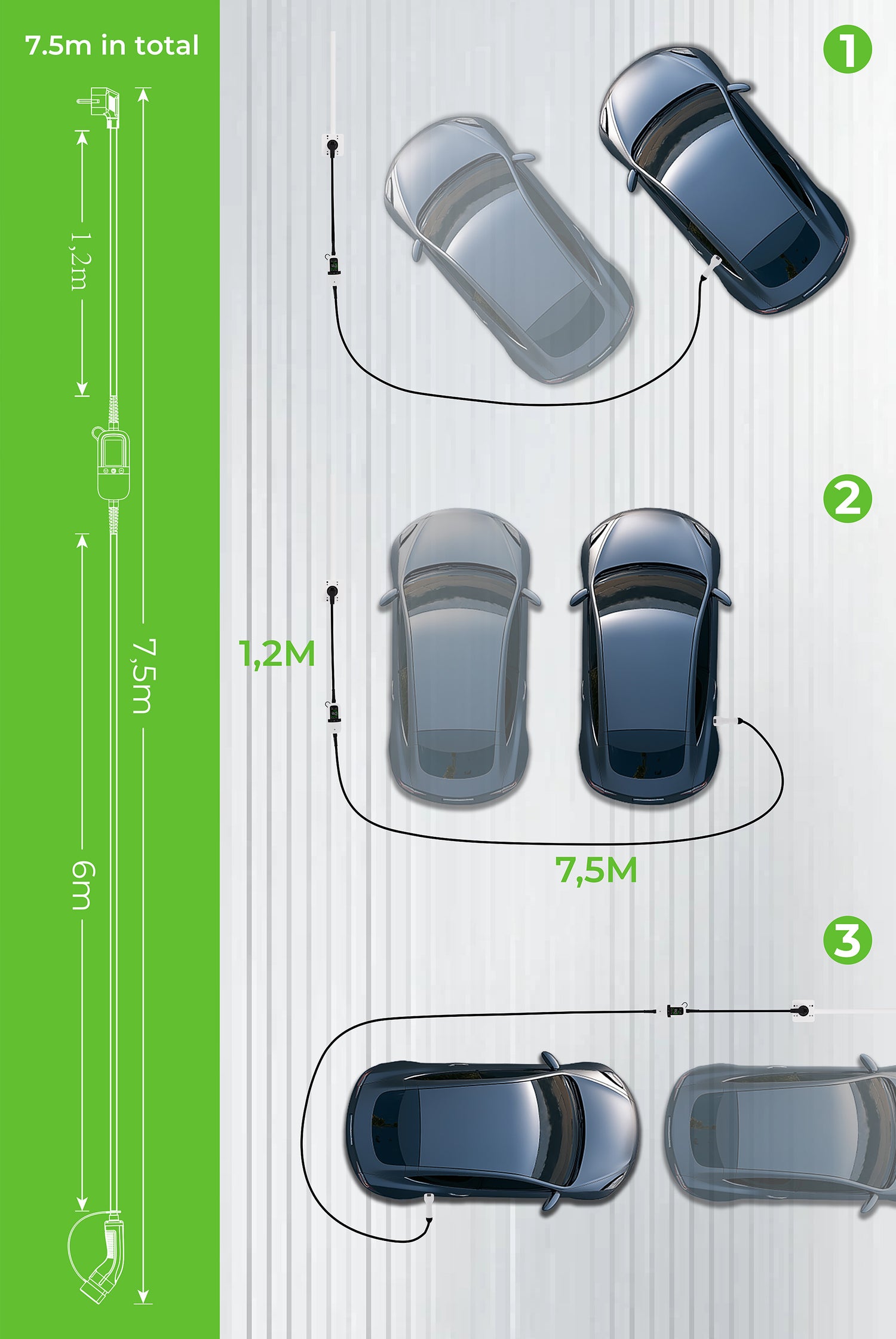 The cable length is determined by the distance between the charging station and the vehicle port. Recommendation: Vehicle length + 1.5m/2m = cable length. The total length of 7.5m is suitable for almost all home charging applications and temporary outdoor use.