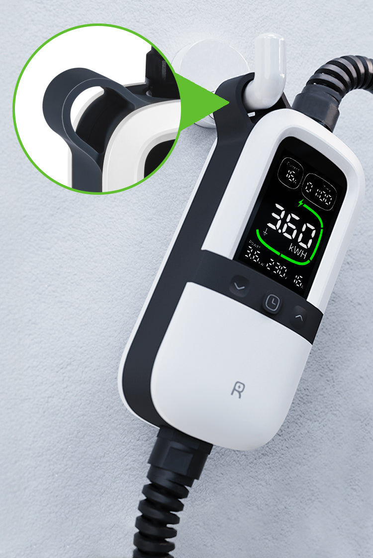 This EV charger has an integrated hook, allowing it to be easily hung during use. It provides flexibility in various charging environments and ensures tidy use, saving space.